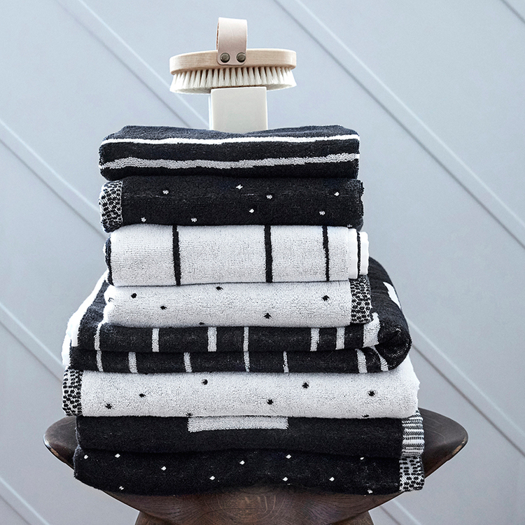 Mäkký obojstranný uterák Punn od dánskej značky OYOY je vyrobený z odolného froté materiálu a má vzor nepravidelných pruhov v čiernej a bielej farbe .