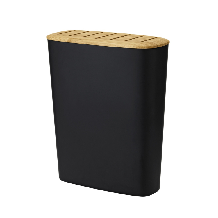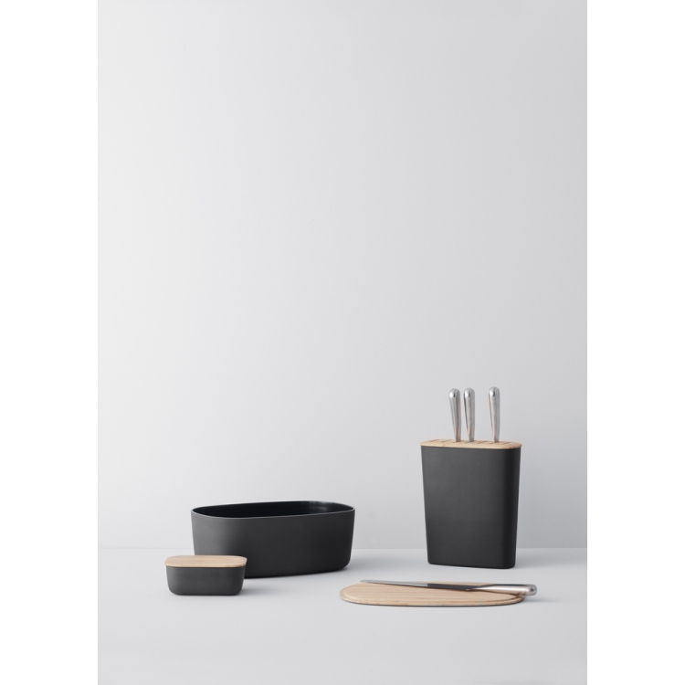 Blok na nože pre dánsku značku Rig-Tig navrhlo dizajnérske duo Markus Jehs & Jürgen Laub. Vďaka minimalistickému dizajnu možno stojan ľahko kombinovať s boxom na pečivo alebo prenosným boxom z rovnakej kolekcie. Má 7 drážok na nože a je dostatočne ťažký, aby pevne stál, keď z neho potrebujete vybrať nôž. Vrchná časť je vyrobená z bambusu a zvyšok povrchu je z melamínu. Výhodou je, že stojan zaberá málo miesta a nože môžete mať vždy po ruke.