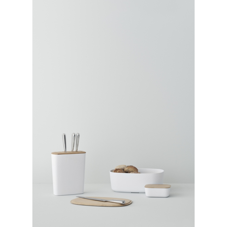 Blok na nože pre dánsku značku Rig-Tig navrhlo dizajnérske duo Markus Jehs & Jürgen Laub. Vďaka minimalistickému dizajnu možno stojan ľahko kombinovať s boxom na pečivo alebo prenosným boxom z rovnakej kolekcie. Má 7 drážok na nože a je dostatočne ťažký, aby pevne stál, keď z neho potrebujete vybrať nôž. Vrchná časť je vyrobená z bambusu a zvyšok povrchu je z melamínu. Výhodou je, že stojan zaberá málo miesta a nože môžete mať vždy po ruke.