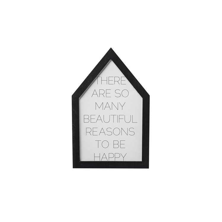 Holé steny sú synonymom prázdneho, nezariadeného a neútulného bytu alebo domu. Premeňte svoje holé steny na skutočný domov s krásnymi dekoráciami od Bloomingville. Drevený rám v čiernej farbe a neobvyklý tvar domčeka sú vyrobené z dreva stromu pavlovnia. Zdobí ho ilustrácia s nápisom "Existuje toľko krásnych dôvodov, prečo byť šťastný", takže je jasné, akú energiu prinesie do vášho domova. Je na vás, kam ho zavesíte. Medzi ilustráciou a rámom je plexisklo, takže sa nemusíte obávať, že sa pri preprave rozbije. Ilustráciu je tiež možné kedykoľvek ľahko odstrániť a vymeniť. Perfektná vec na steny.