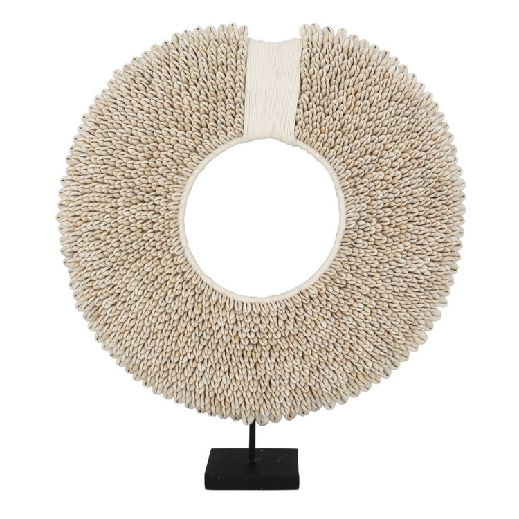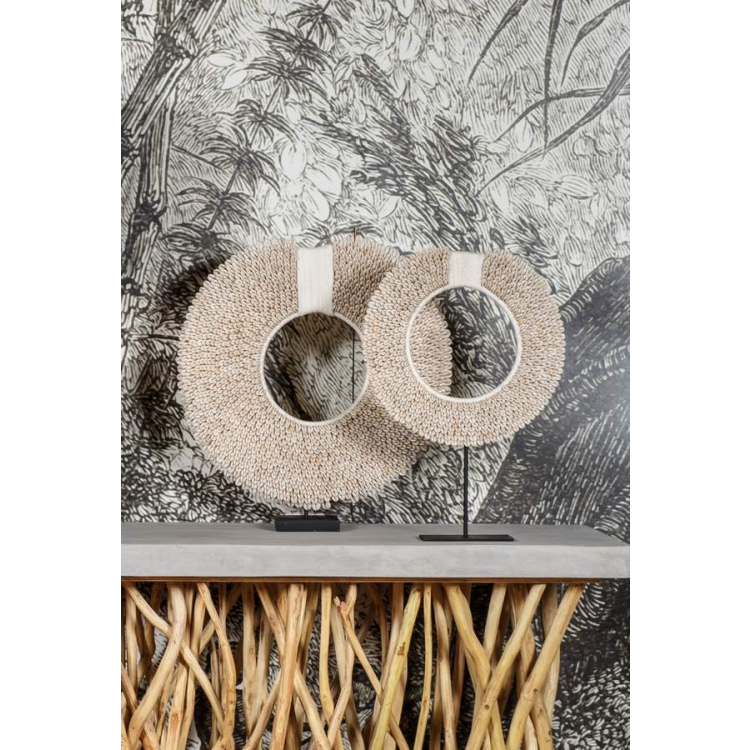 Nespočetné množstvo mušlí v prírodných odtieňoch v sústredných kruhoch v kombinácii s kovovým stojanom vytvára harmonickú, ale stále bohémsku kombináciu. Vyčleňte si doma miesto pre dekoráciu Papoua a vytvorte oázu, ktorá bude šíriť útulnú atmosféru v celom vašom dome.