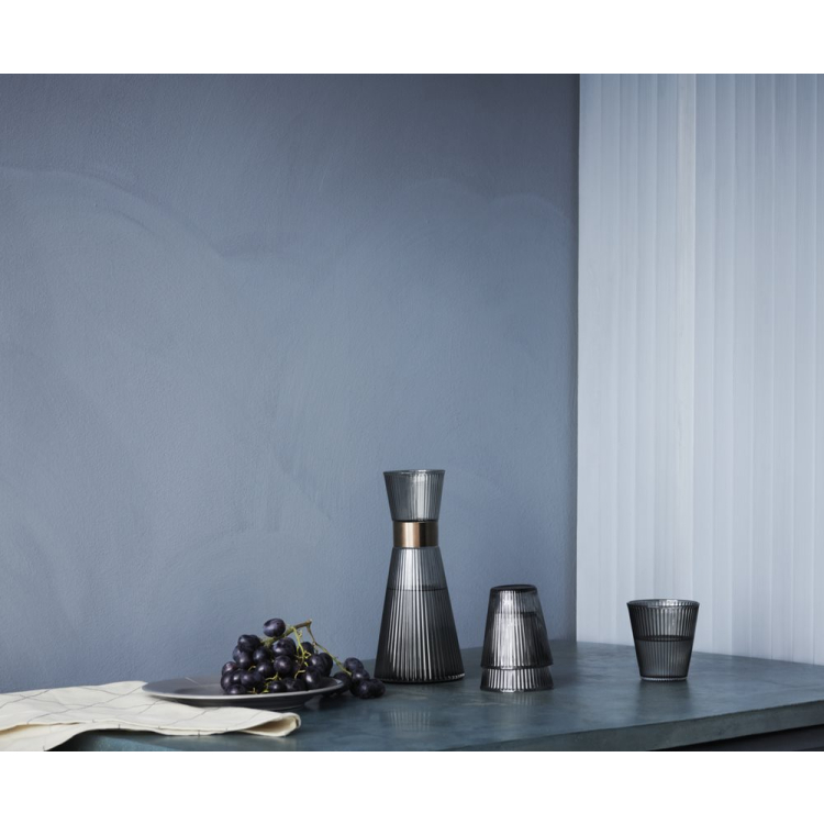 Podávajte vodu štýlovo s karafou Grand Cru od dánskej značky Rosendahl. Stačí pridať vetvičku mäty alebo mrazené či čerstvé ovocie, aby ste získali príjemne osviežujúcu chuť. Karafa je ľahko miešateľný a nepostrádateľný kúsok do vašej kuchyne a poslúži aj ako luxusná dekorácia slávnostne prestretého stola. Je veľmi obľúbená vďaka svojmu ergonomickému tvaru zvýraznenému oceľovým prstencom s patinou. Karafa je vyrobená z ručne fúkaného skla a jej povrch zdobia jemné ryhy. Moderná dymovo sivá farba sa vám bude páčiť a s pohármi z rovnakej série Grand Cru vytvoríte krásnu dizajnovú súpravu.