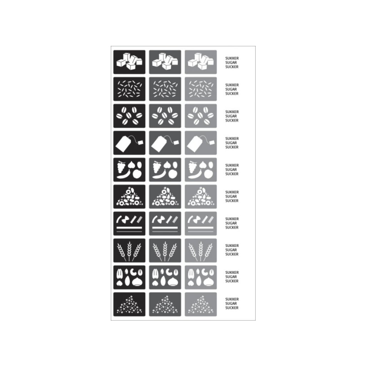 Sada obsahuje 10 rôznych ikon / každá ikona má tri odtiene čiernej a sivej farby, ktoré umožňujú rozlíšiť tri druhy cestovín, orechov, cukru atď.